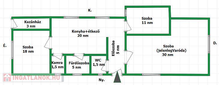 Az ingatlannak az alap területe 95 nm, 3 szoba, konyha, fürdőszoba, kamra, WC, kazánház.