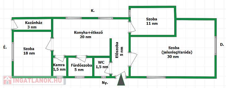 Az ingatlannak az alap területe 95 nm, 3 szoba, konyha, fürdőszoba, kamra, WC, kazánház.