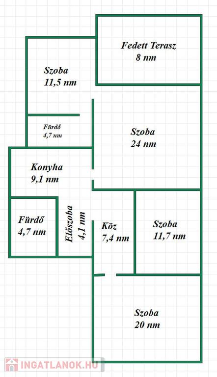 Elosztása: 4 db szoba, konyha, előszoba, közlekedő és 2 db fürdőszoba.