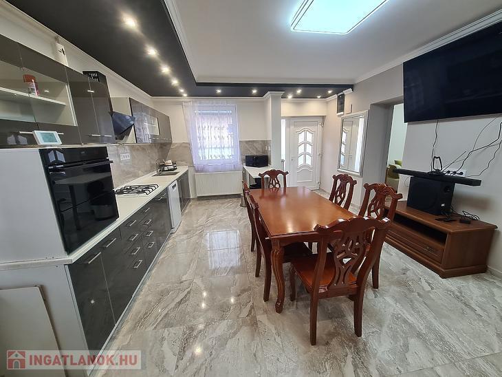 3 szoba, konyha + étkező, zuhanyzós fürdőszoba + mellékhelyiség, mellékhelyiség, kamra, közlekedő.