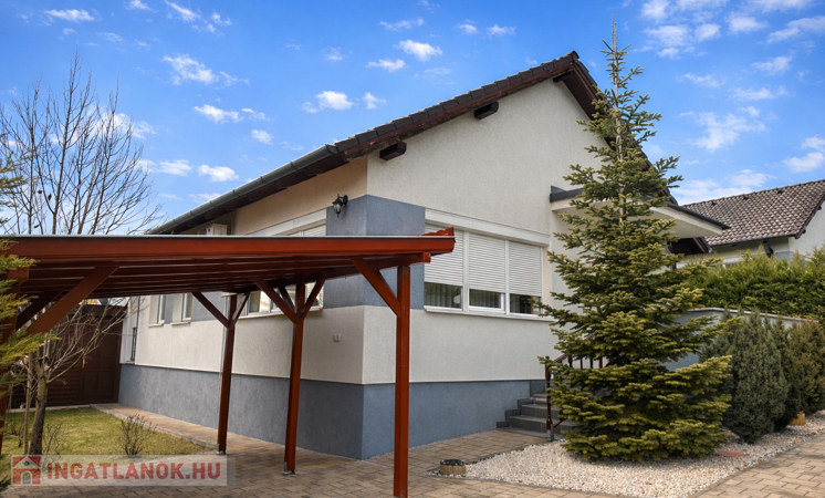 A bejárat egy 9,2m² teraszról nyílik,2 db melléképület található az ingatlan két oldalán,melyek közül a kisebbikben kézmosó és WC került kiépítésre. A nagyobb melléképület inkább tárolóként funkcionál. A ház déli -keleti és nyugati oldalakról nagy méretű redőnyös szúnyoghálós Aereco szellőztető rendszeres ablakokkal biztosítja a kellemes világos tereket. Riasztó berendezés, kaputelefon, szellőztető és öntöző rendszer teszik még komfortosabbá. Az ingatlan két oldalán könnyen karbantartható gondozott parkosított kert található,a környék csendes barátságos,a főváros 15 perc alatt elérhető kényelmesen.