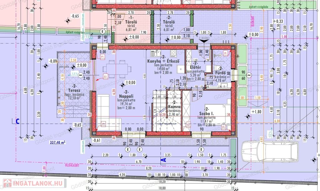 - Földszint: előtér, nappali-konyha-étkező, kamra, fürdőszoba + 6,81m2 tároló + 12,5m2 terasz.