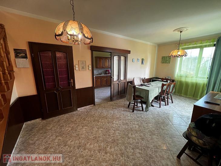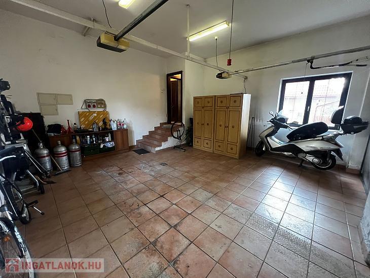 Nappali, konyha, étkező, közlekedő, wc, előszoba, 2 állásos garázs.