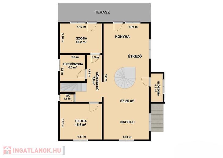 2 szoba, nappali + konyha + étkező, zuhanyzós/kádas fürdőszoba, mellékhelyiség, előszoba, közlekedő, nagyméretű terasz.