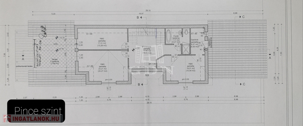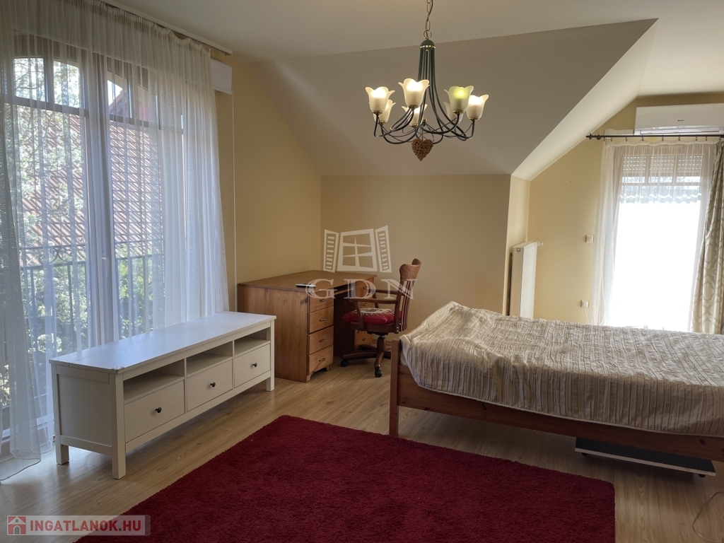 A klimatizált felső szintre, kényelmes fokkiosztású stabil lépcsőn juthatunk fel, ahol egy 19,4nm (nettó 18,5) közlekedő, három egyenként 17nm (nettó 13,2), 23,2nm (nettó 20,2) és 18nm (nettó 15,5) szoba, valamint egy 6nm (nettó 5) gardrób és 7,1nm (nettó 5,2) fürdőszoba került kialakításra.