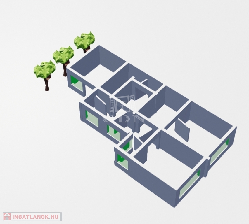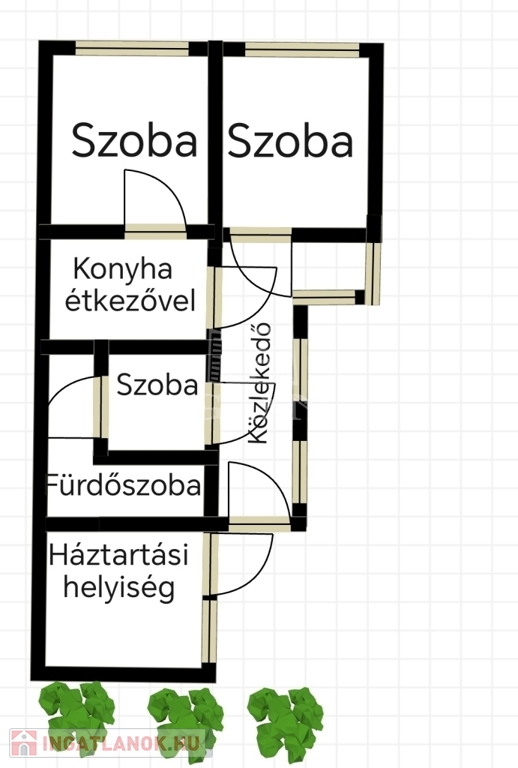 Felosztása: közlekedő, fürdőszoba, 2 különálló szoba, egy szoba, amely hallként funkcionál jelenleg (nincs rajta ablak, azonban kisebb átalakítással, könnyedén ablakossá alakítható), egy nagy méretű konyha, étkezővel, és egy közel 12 nm nagyságú háztartási helyiség.