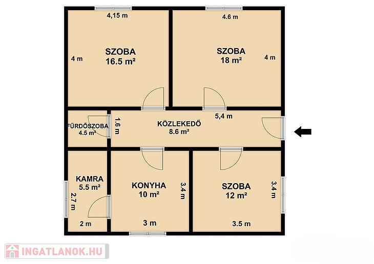 3 szoba, étkezős konyha, kamra, zuhanyzós fürdőszoba + wc, közlekedő.