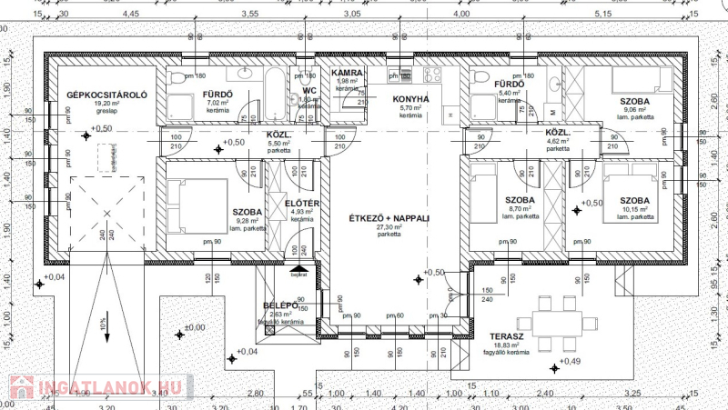Vasbeton sávalap, 30 cm-es Porotherm tégla főfalak 12 cm-es dryvit hőszigeteléssel. Műanyag homlokzati nyílászárók 3 rétegű üveggel. Fa födém 30 cm. kőzetgyapot hőszigeteléssel. Bramac cserép héjalás. Festés, burkolás, szaniterek, belső ajtók választhatók. A hideg, meleg burkolatokat 6000 Ft./m2 árig, a belső ajtókat 75000 Ft./db. árig tartalmazza a vételár. Mosdó csaptelep: 25 ezer Ft., mosdó: 25. ezer Ft., Kádtöltő csaptelep: 40 ezer Ft., Fürdőkád: 100 ezer Ft., Zuhany csaptelep szett: 40 ezer Ft. Zuhanykabin épített zuhanyhoz: 200 ezer Ft., WC csésze: 25 ezer Ft. (beépített tartályos wc-k kerülnek kialakításra)