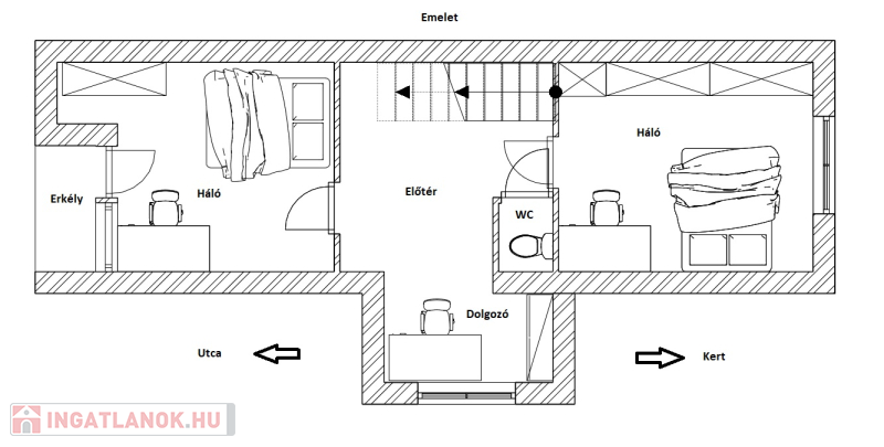 - emelet: előtér, 2 nagyméretű szoba, dolgozó sarok, WC