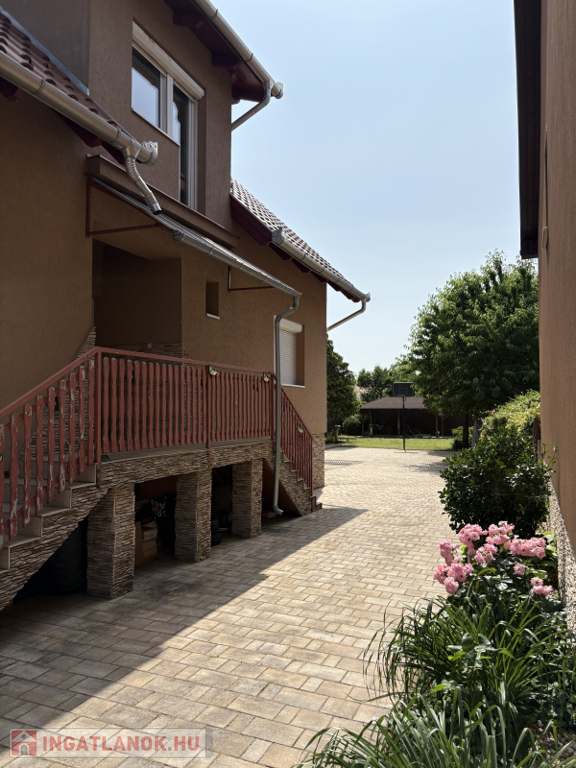 A telek 541 nm-es, ami minimum 4 autónak biztosít kényelmes parkolást a térkövezett udvarban. A kert többi részén medencének kialakított burkolt terület, egy szaletli és füves rész lett kialakítva.