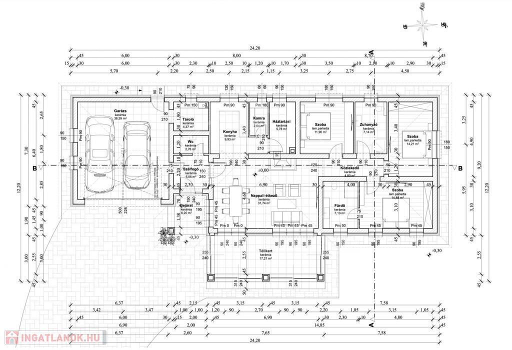 A dupla garázs nemcsak két gépjármű számára kínál kényelmes parkolást, hanem kapcsolódik hozzá egy külön kazánház, ami egyben tároló helyiség is, amely tovább növeli az ingatlan funkcionalitását.
