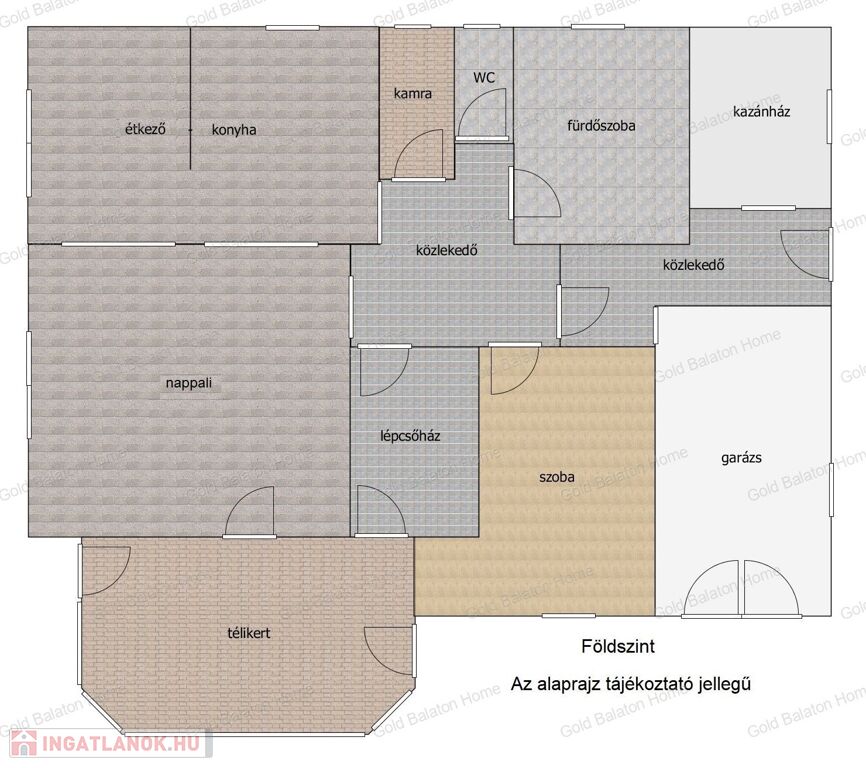 - Földszinti helyiségek: amerikai konyhás nappali 49,5 m2, szoba 15,5 m2, fürdőszoba 11 m2, kamra 3 m2, külön WC 1,5 m2, közlekedő 9 m2, közlekedő 7,5 m2, lépcsőház 7 m2, télikert 19,5 m2, kazánház 7,5 m2, garázs 16 m2.