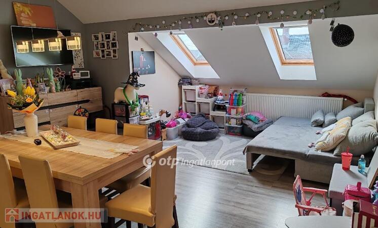 A tetőtér jelenleg lakott, itt található nagy nappali-konyha-étkező egyben. Kényelmes minden igényt kielégítő nagyméretű konyha van. A nappalit a konyhától az étkező választja el. Ebből a közös lakrészből nyílnak a 3 db hálószoba és a fürdőszoba. Van külön wc, tároló, speiz.