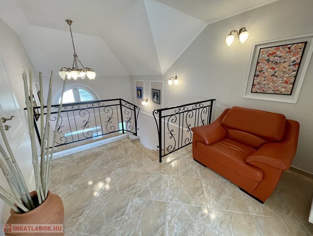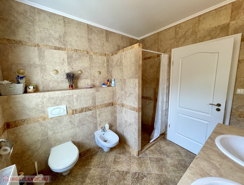Gyenesdiáson a Balatont parttól ötszáz méterre, csendes zsákutcában kínálunk eladásra egy 729 m2-es telken egy kétszintes 250 m2-es elegáns családi házat! Tulajdoni lapon kivett lakóház és udvarként szerepel. Az épület 2014-ben épült, téglaépítésű / 10 cm-es külső szigetelés / és cseréptetővel fedett. Az épület nyílászárói szigetelt műanyagok, redőnnyel és szúnyoghálóval szereltek. A fűtésről és melegvíz ellátásról kondenzációs gázkazán gondoskodik. A bejövő víz tisztaságát vízlágyító berendezés biztosítja. Az épület felső szintje hűtő-fűtő klímákkal felszerelt! A hálószobák minőségi laminált padlóval a többi helyiség igényes kerámia lapokkal burkoltak. Az udvarra és a garázsba egyaránt távirányítóval vezérelt kapun és garázsajtón lehet bejutni. Az épület riasztóberendezéssel is felszerelt. Az udvar állandóan gondozott, / öntözőberendezéssel ellátott / és gyümölcsfákkal, valamint díszes bokrokkal tarkított. Az épület rendszeresen karban tartott.