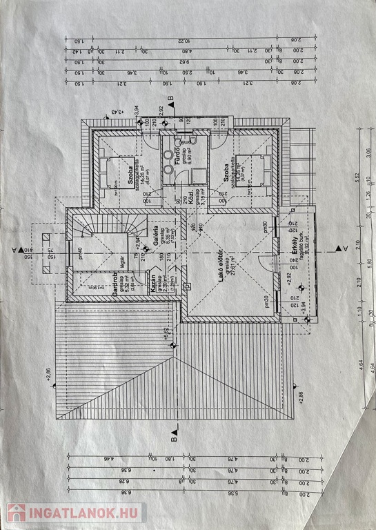 a lépcsőházból feljutva a második szinten: Galéria 8,35 (7,53) m2, kazán 2,30 (1,28) m2, gardrób 5,32 (2,65) m2, lakó előtér (nappali) 27,61 m2, erkély 11,92 m2, szoba 14,26 (8,07) m2, fürdőszoba + WC 6,90 m2, szoba 14,26 (8,07) m2, közlekedő 3,15 m2, erkély 4 m2 lett kialakítva.