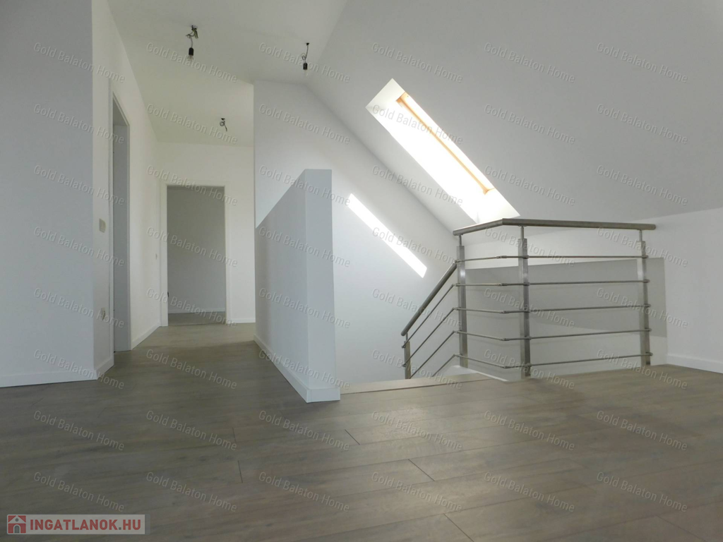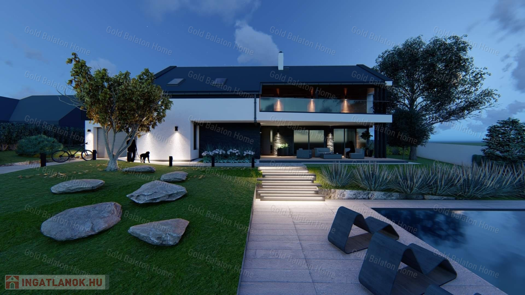 Luxus családi ház 1397 m2-es területen helyezkedik el nyugodt, csendes környezetben. A kettő szintes ház öt hálószobával, kettő nappalival, konyha étkezővel, négy fürdőszobával, szintenként fedett terasszal épült. Kényelmes életteret biztosít Ön és családja számára a ház nagy udvarral. Az emeleti teraszról panorámás kilátás a Balatonra. Medence csak igény esetén épül meg, mely költsége nem szerepel az eladási árban.