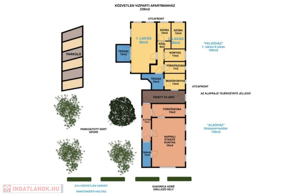 A lakóingatlan két részből áll, egy "felsőház", amely 100m2 alapterületű és jelenleg két apartmanra van osztva. Szoba, konyha, fürdőszoba, mindkettő önálló terasszal. Valamint egy teraszról nyíló, közös háztartási helyiség tartozik mindkét lakáshoz.