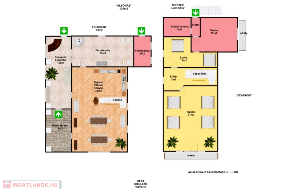 Az "alsóház" kétszintes, tetőtér beépítésű, összesen 130m2 (nettó) lakótérrel rendelkezik.