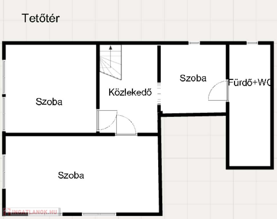 -Emelet: két tágas, valamint egy kisebb szoba, fürdőszoba toalettel,