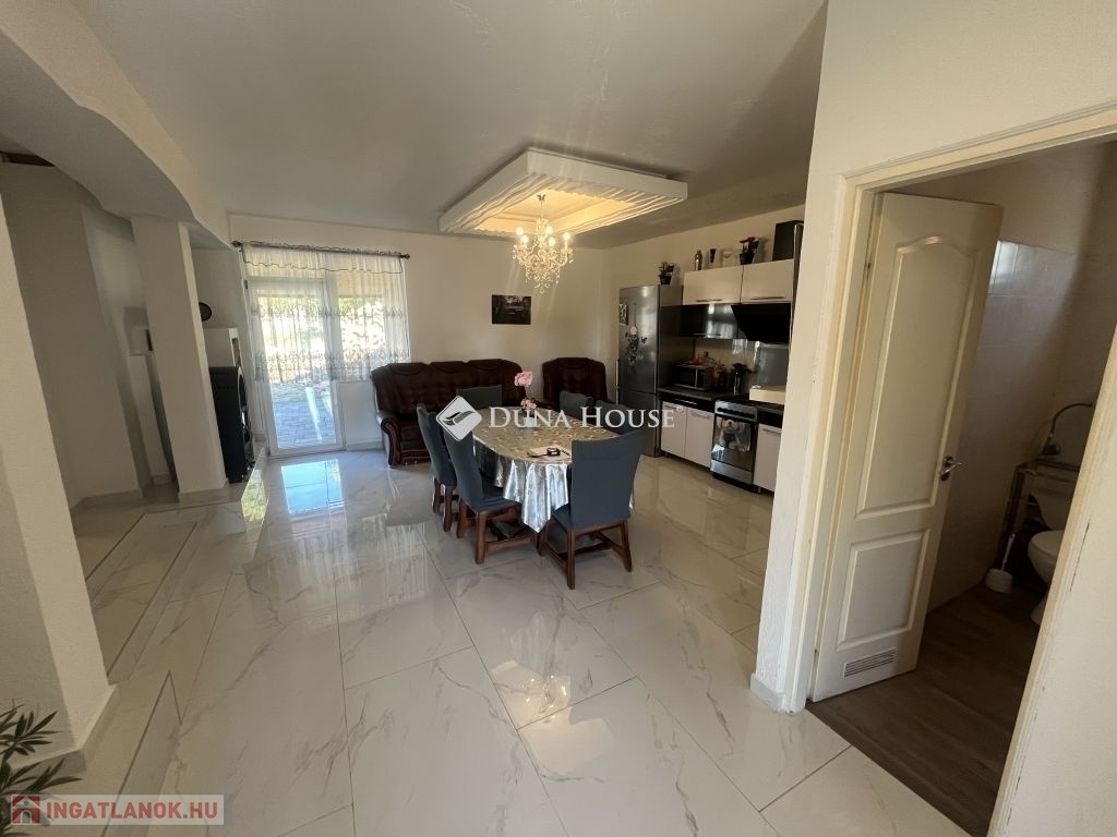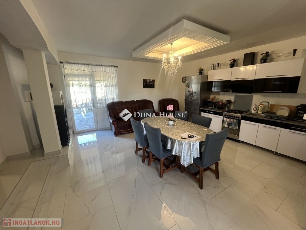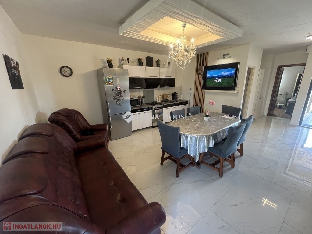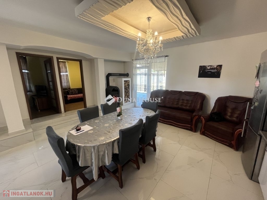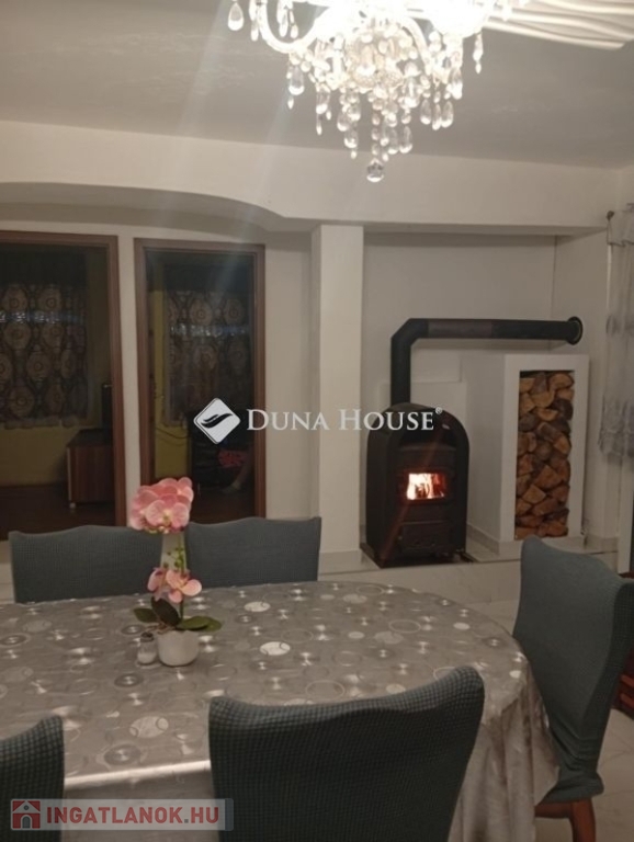 Az ingatlan fő élettere egy világos, tágas amerikai konyhás nappali, amely kiválóan alkalmas nagyobb családi vagy baráti összejövetelekhez is. A helyiséget modern, hófehér burkolatok teszik elegánssá és igényessé. A tradicionális kályha nemcsak praktikus fűtési megoldás, de meleg, családias légkört is teremt.