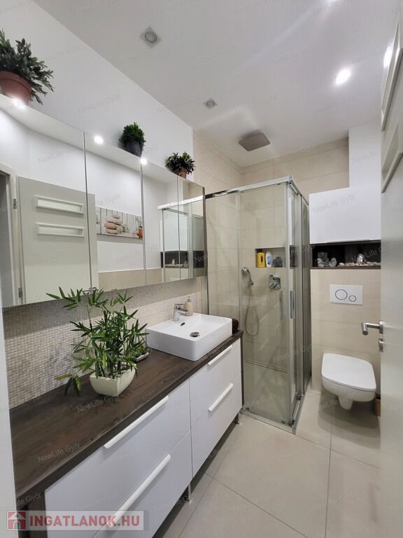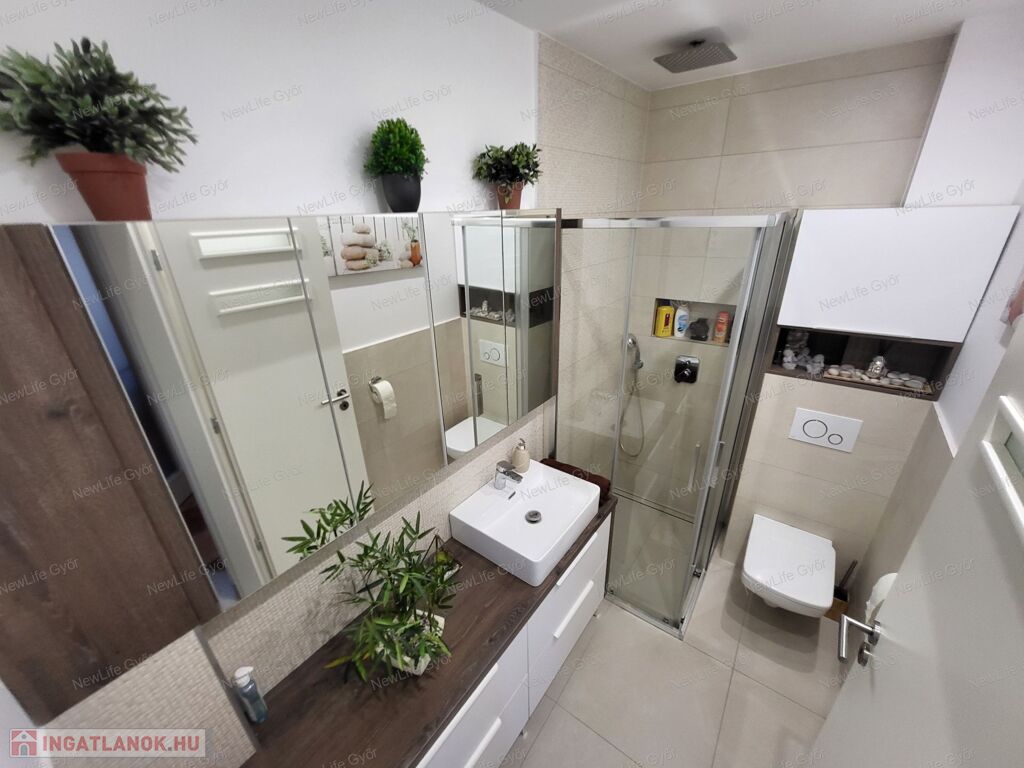 - Két fürdőszoba – az alsó zuhanyzós, a felső kádas, dupla mosdóval