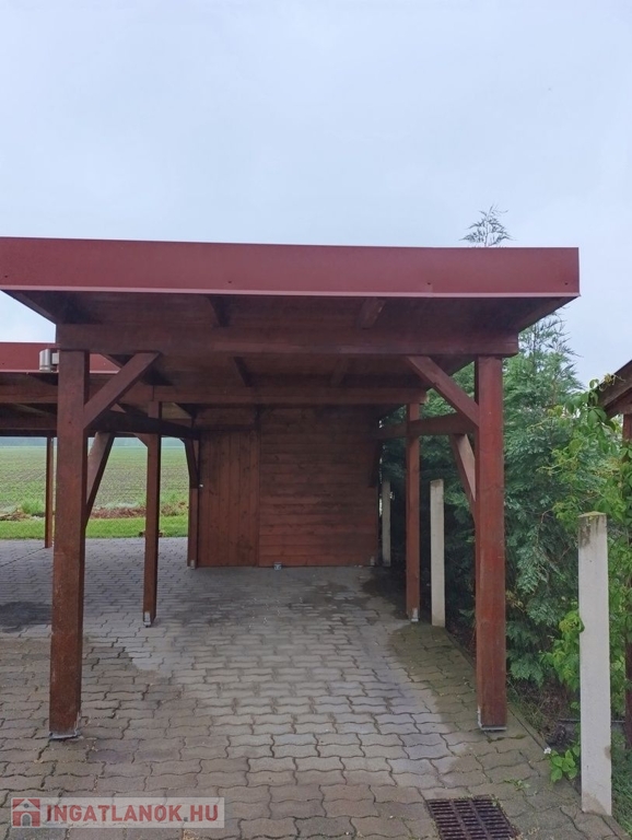 A zárt kapun belül egy fából épült, fedett gépkocsi-beálló is rendelkezésre áll, saját kis tárolóval – praktikus és esztétikus kiegészítője az ingatlannak.