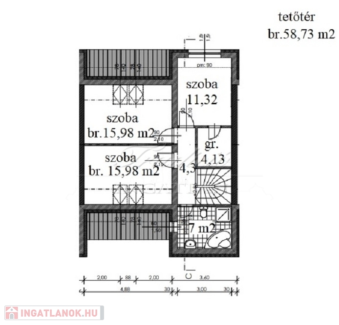 Az emelet területe összesen br. 58,73 m2, amely következő helyiségekből áll: szoba br. 15,98 m2, br. szoba 15,98 m2, szoba 11,32 m2, gardrób 4,13 m2, fürdőszoba 07,05 m2, közlekedő 4,27 m2.
