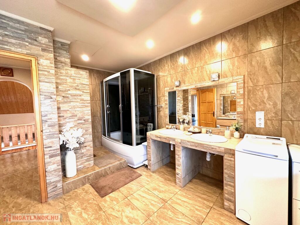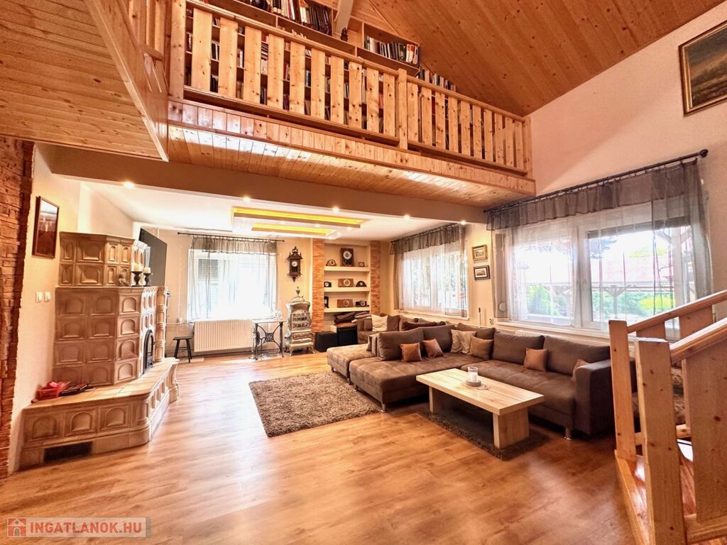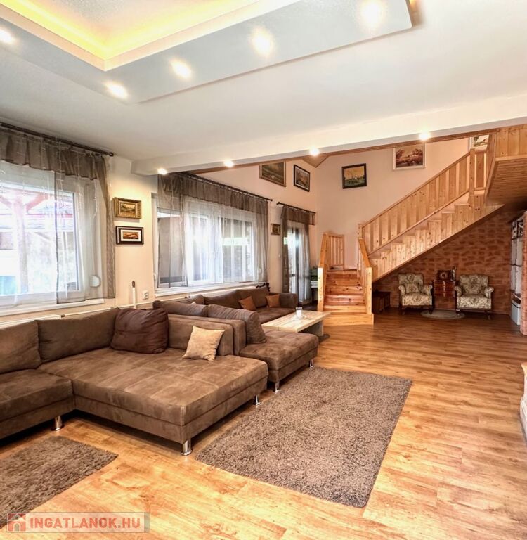 - ebben a házban két lakrész található a fő része 116 m2 alapterületű 3 szinten!! Nappali + 4 szoba + könyvtár galéria+teljes pince garázzsal!!!
