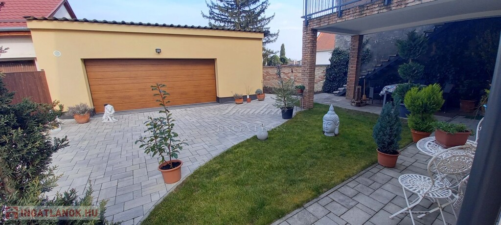 A szépen karbantartott, parkosított, térkövezet telken a családi ház mellet egy dupla garázs és egy tároló is helyet kapott. A nagyméretű bejárati kapu és a szankcionált garázskapu is motorral van szerleve. A garázs mögött parkosított, fűvel beültettet rész található.