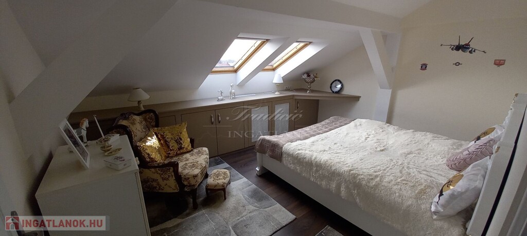 Az emeleti szint a hátsó terasz irányából is megközelíthető, itt egy étkezős konyha (még nem használt, vadonatúj konyha, felső kategóriás gépekkel) , egy fürdőszoba, valamint 2 szoba található, amelyből az egyik szoba nappaliként a másik pedig egy saját erkéllyel rendelkező hálószobaként funkcionál. A tetőtérben további két kellemes méretű hálószoba, a háztartási helyiség és a harmadik fürdőszoba található.