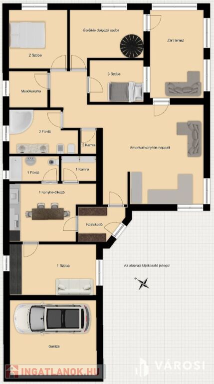 • tágas nappali-konyha és közlekedő (~46 m²)