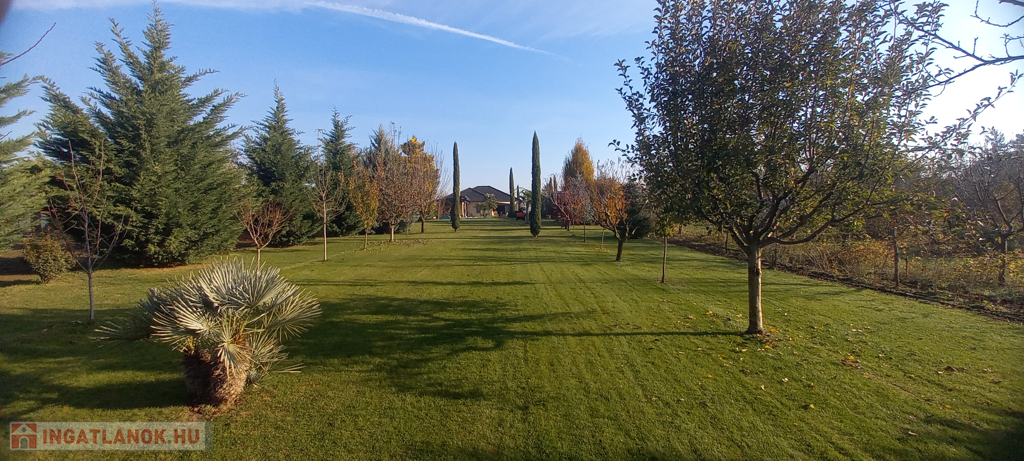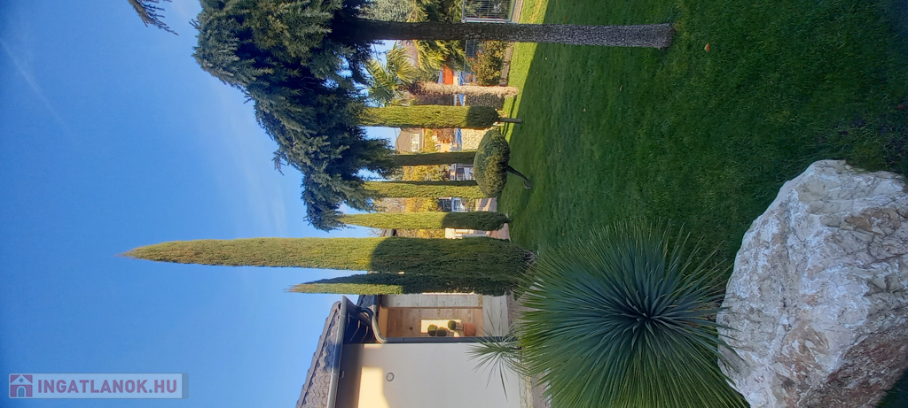 Az 1830 m2-es gyönyörűen karbantartott, parkosított, trópusi, mediterrán hangulatú telken a ház mellett egy medence, egy kazánház és egy fedett tároló is helyet kapott.