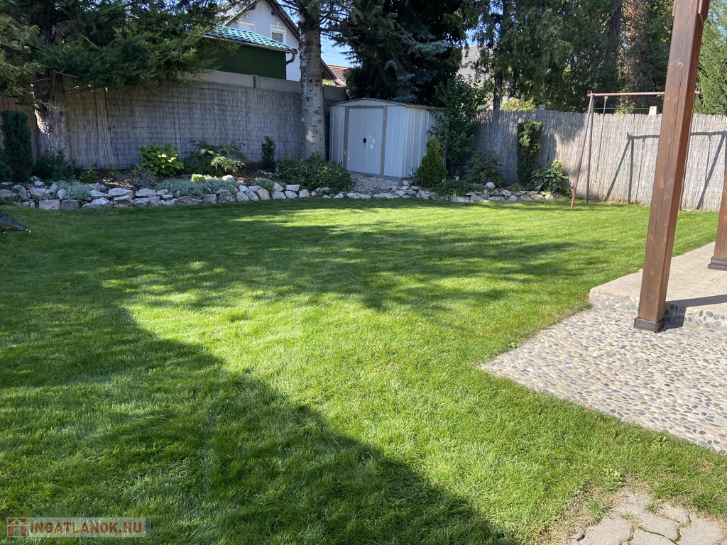 A gyönyörűen karbantartott, parkosított 311 m2-es, 40-50 éves fákkal, virágokkal, vakondhálóval, automata öntözőrendszerrel, robotfűnyíróval rendelkező telken a ház mellett egy 6 m2-es kerti tároló, grillező, valamint egy térkövezett rész is helyet kapott, ami ideális medence, vagy jakuzzi elhelyezése. A térkövezett gépkocsibeálló az előkertben található.