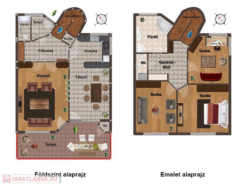 Elrendezése: nappali + 3 szoba, konyha + étkező, kamra, 2 fürdő + WC, előtér, közlekedő, lépcsőfeljáró, gardrób, terasz, kert