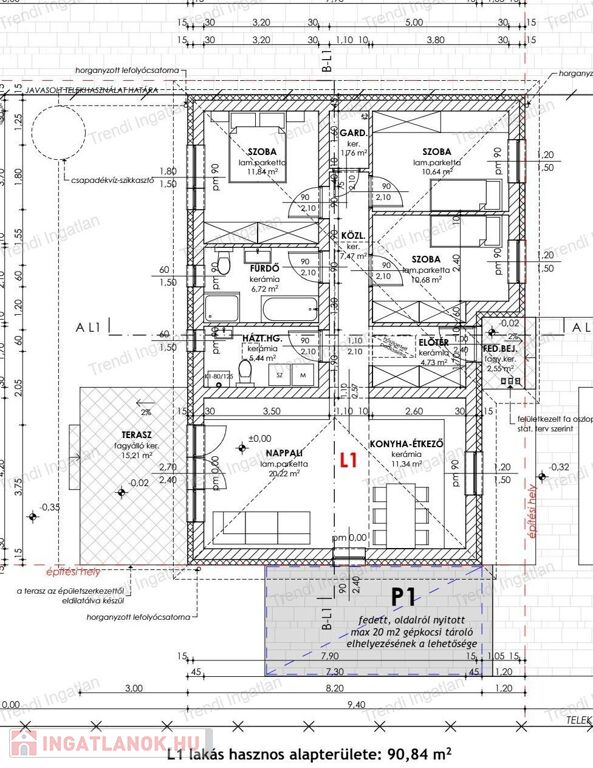 A remek elosztású házban amerikai konyhás nappali, 3 szoba, fürdőszoba, háztartási helyiség, előtér, gardrób, közlekedő található. A nappaliból 15,21 nm-es terasz nyílik.