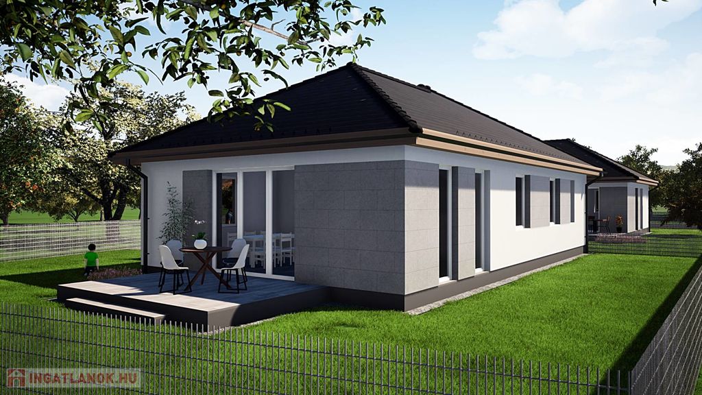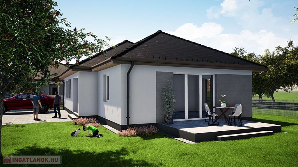 A 523 m2 saját telekhányaddal rendelkező 92,45 m2-es ház helyiségei: amerikai konyhás nappali, 3 hálószoba, fürdőszoba+ WC, közlekedő, háztartási helyiség, WC és előszoba.