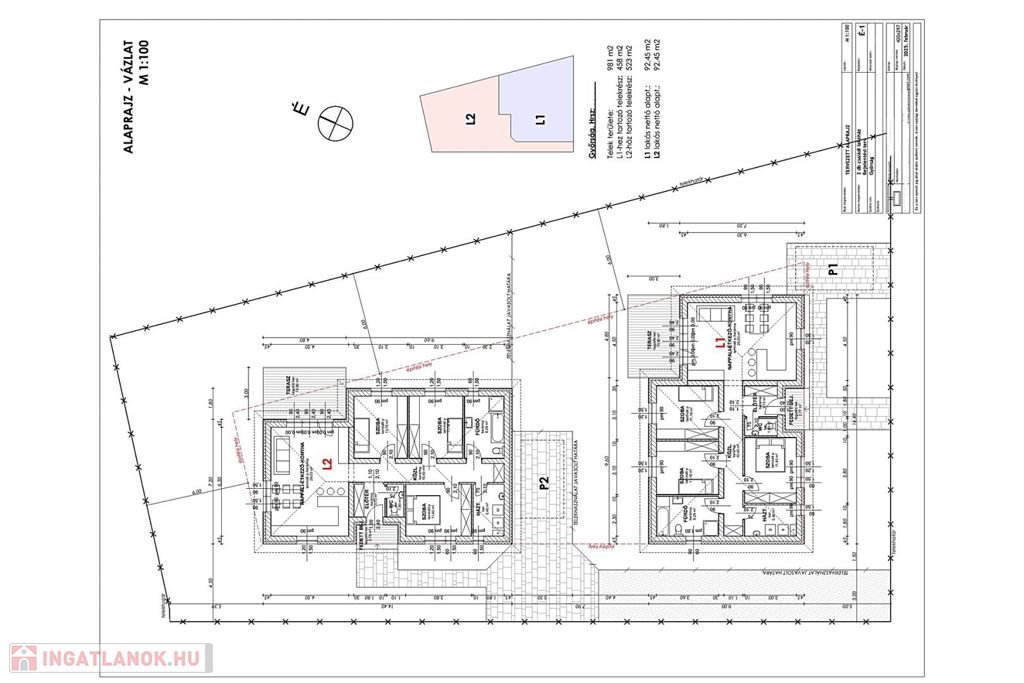 A két épület egy 981 m2-es nagyon szép panorámás telken épül fel. A házak teljesen elkülönülnek egymástól, közös faluk nincs. Kerítéssel elválasztható a két telekrész.