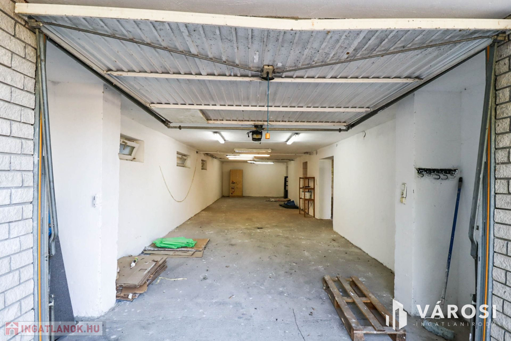 A 2 garázs mellett térkövezett parkolási lehetőség, gyerekeknek 2 kialakított játszótér, az udvar hátsó fele füvesített, dísznövényekkel, tujákkal, gyümölcsfákkal árnyékolt.