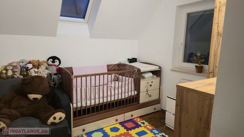 Győrújbarát csendes, abszolút forgalommentes zsákutcájában, enyhén lankás, kiváló panorámával rendelkező 2145 m2-es szépen gondozott, bekerített telken eladó ez a 2000-ben épült, pár éve átépített és felújított nappali + 3 szobás kétszintes családi ház.