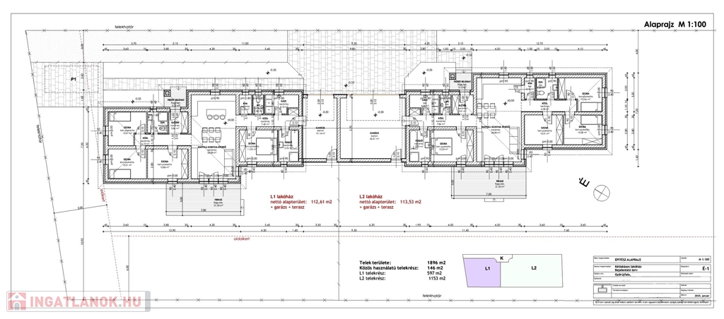 A két épület egy 1896 m2-es telken épül fel. A házak garázsokkal kapcsolódnak egymáshoz. Kerítéssel elválasztható a két telekrész. A garázsokhoz vezető út 146 m2 közös.