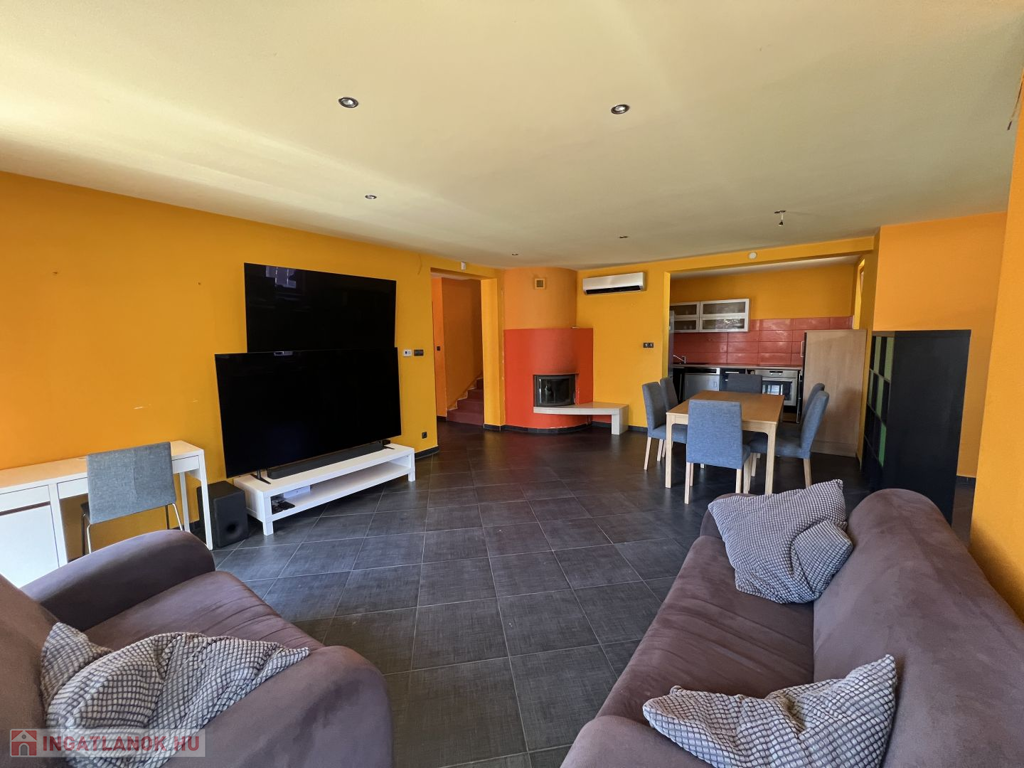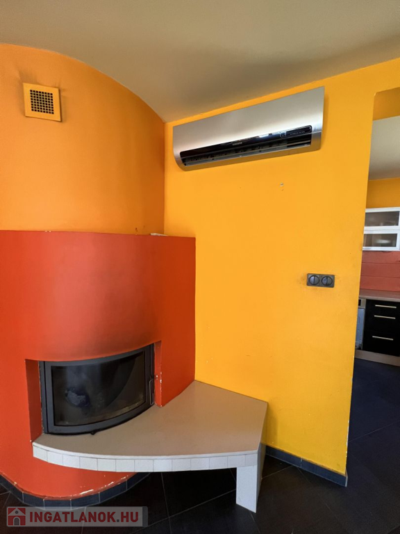 A nappaliban alternatív fűtési lehetőségként kiválóan működő kandalló található.
