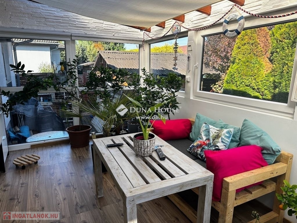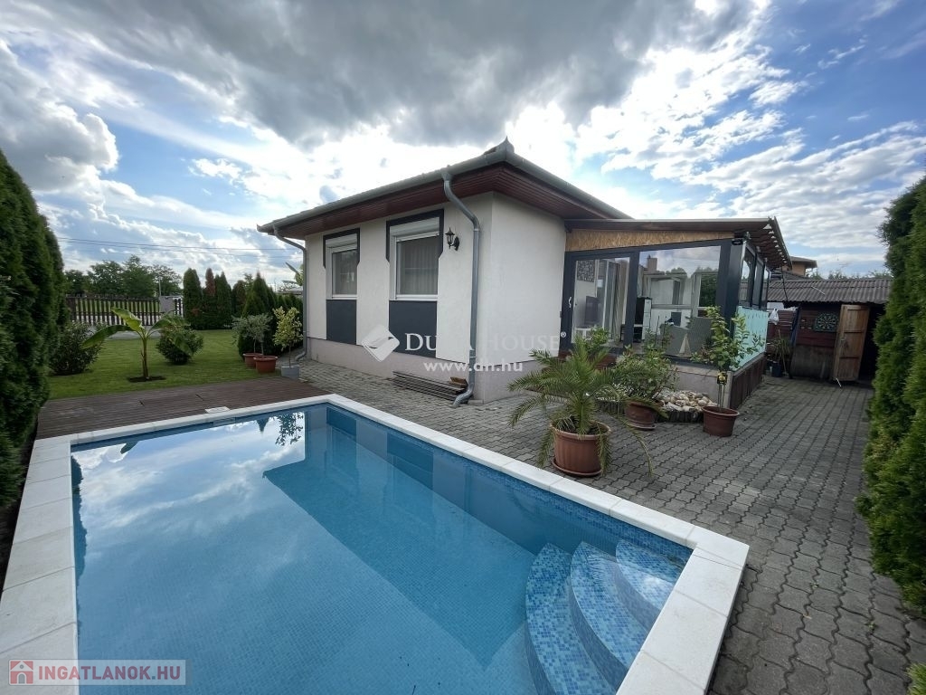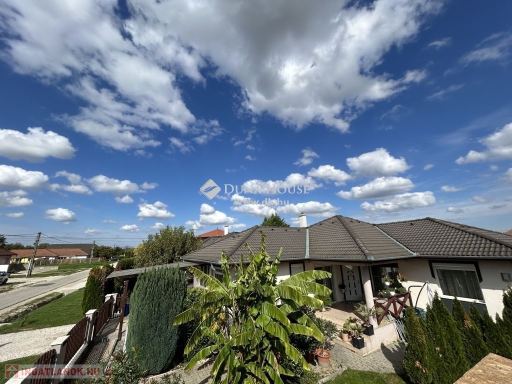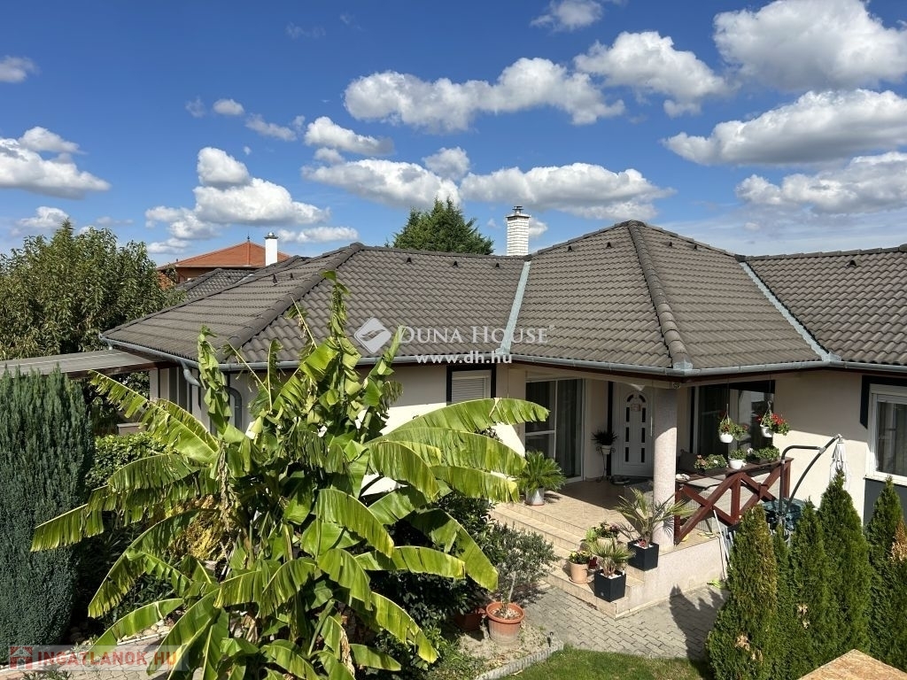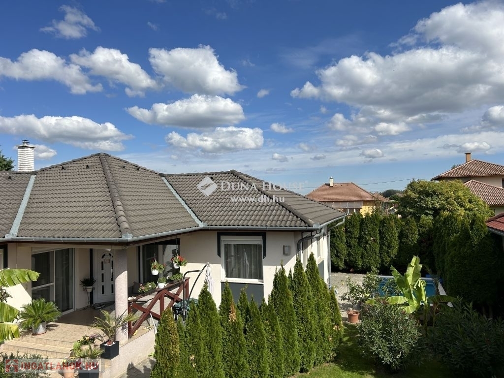 Idilli családi otthon Győrzámoly szívében – Nyugalom, kényelem és kertvárosi élet egy helyen!540 m²-es telken áll ez a 136 m²-es, tökéletes elosztású családi otthon, amely ideális választás mindazoknak, akik nyugalomra és kényelemre vágynak. Az ingatlan elrendezése: tágas nappali, étkező, konyha, két fürdőszoba (az egyik WC-vel), WC, négy szoba, kamra, napfényes télikert, valamint egy terasz, ahol élvezheti a kert nyugalmát.Jellemzők:Fűtés: gáz-cirkó radiátoros hőleadókkal, valamint 3,5 kW-os Fujitsu inverteres klíma biztosítja a hűtést és fűtéstKiváló minőségű építési anyagok: 38-as Porotherm téglafal, 5 cm hőszigetelt vakolat, Bramac cserépLaminált padló a szobákban és télikertben, járólap a többi helyiségbenMűanyag, kétrétegű nyílászárók szúnyoghálóval és redőnnyelKét fedett gépkocsibeállóKert és extrak:A kert központi eleme egy 15 m²-es medence homokszűrős gépészeti aknával, amely tökéletes nyári felfrissüléshez és családi kikapcsolódáshoz. egy 10 m²-es faház a kertben található, külön locsolóóra, valamint fúrt kút, amely gazdaságossá teszi az öntözést. A gondozott, zöld környezet pihenésre és kikapcsolódásra csábít.Miért érdemes Győrzámolyon otthont venni?Győrzámoly a nyugodt, biztonságos környezetéről híres, remek választás mindazok számára, akik városi közelséget, de falusias nyugalmat keresnek. Könnyű megközelíthetősége Győrhöz ideális azok számára, akik gyorsan elérhető munkahelyet vagy oktatási intézményt keresnek, így élvezik a természet közelségét. A környéken kiváló iskolák, óvodák, bevásárlási lehetőségek és szabadidős programok találhatók, melyek biztosítják a kényelmes életminőséget minden korosztály számára.