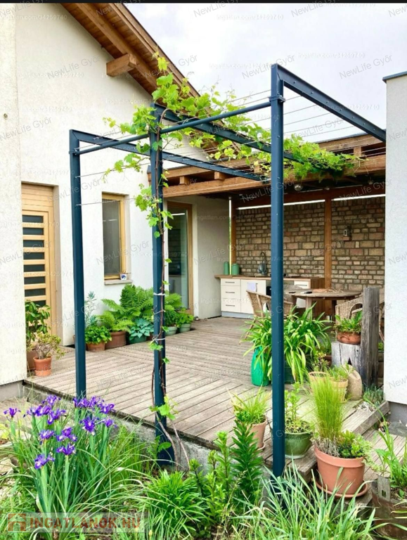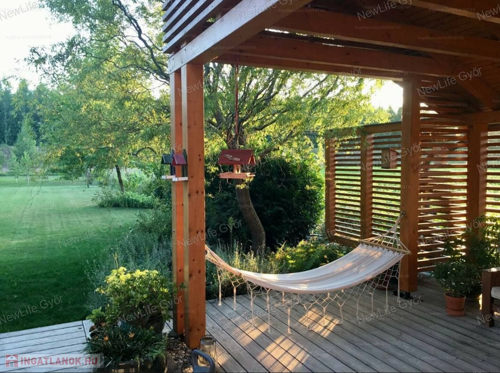 Valamint elkerített kutyaudvar,tüzifa és kuka tároló,dekor medence a hátsó teraszon,magaságyások a kert végében,szép, gondozott kert, nagy méretű fákkal, dús növényzettel, termő gyümölcsfákkal.