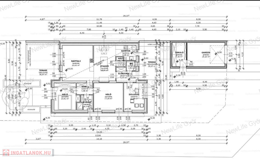 A kertben 2 ellentétes tájolású, részben fedett terasz (25 + 36 m2).