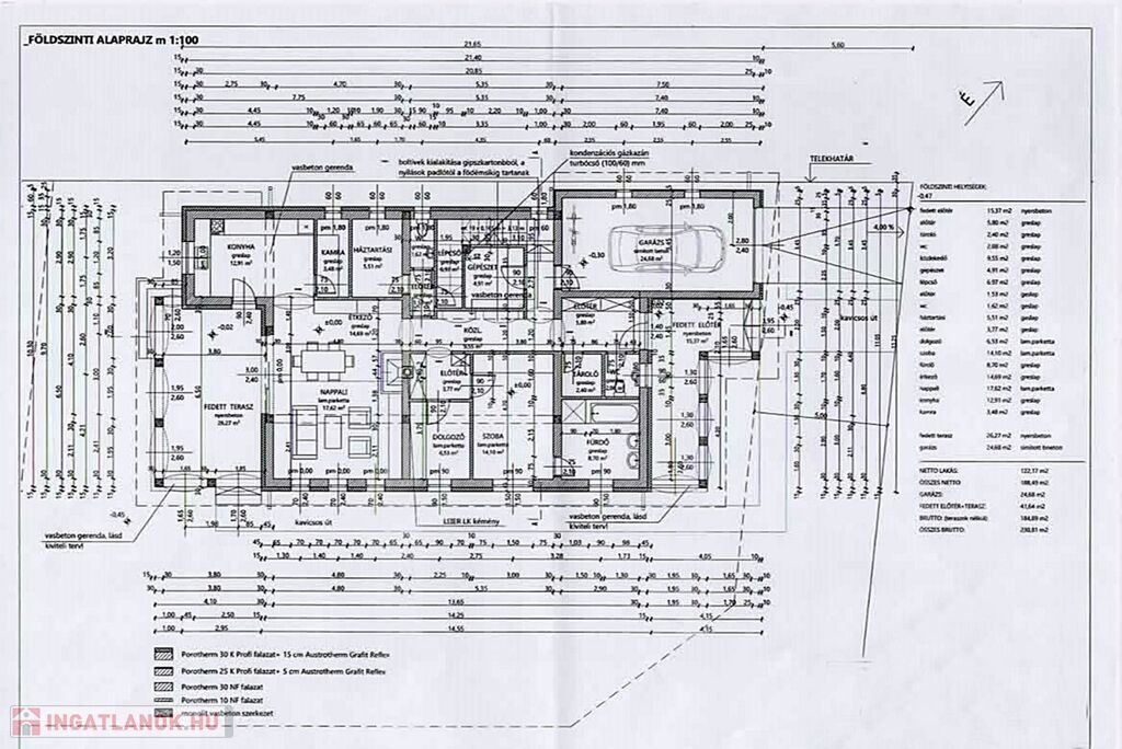 GARÁZS 24,68 m2, fedett TERASZ 26,27 m2, fedett bejárati terasz 15,37 m2.