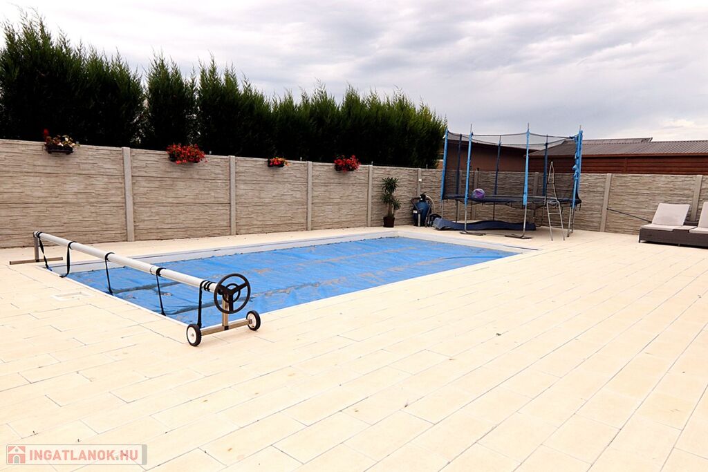Az udvaron található még egy 8x4 m-es épített MEDENCE vízforgatóval, homokszűrővel, LÉPCSŐVEL, LED világítással.