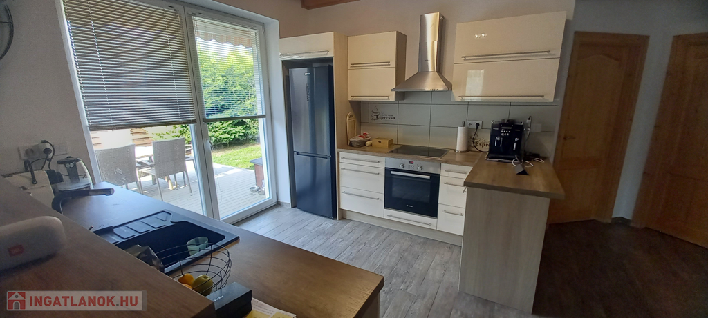 Az egy térben lévő nappali, étkező és az amerikai konyha tágas, világos teret eredményez. A 30 m2-es teraszra és az udvarra a konyhaszigettel is rendelkező konyhából tudunk kijutni. A szépen parkosított, térkövezett telken a családi ház mellett 2 db fából készült tároló, valamint egy kerti grillező is helyet kapott.