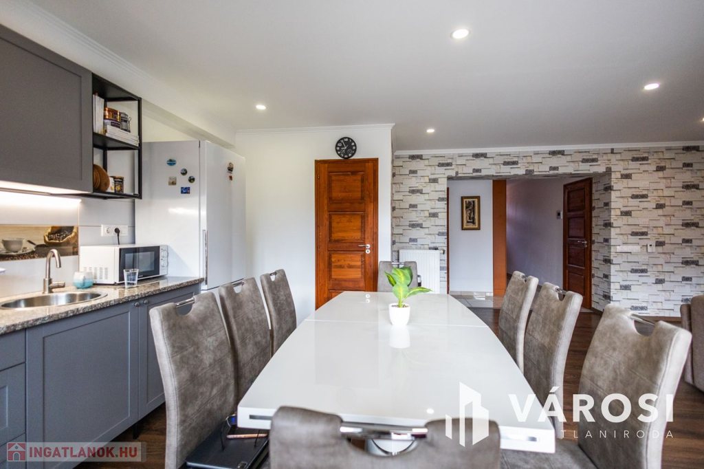 Gyula belvárosában, mindenhez közel eladóvá vált egy 207 nm alapterületű, felújított ikerház. Az ingatlan két szintes és különlegessége, hogy az amerikai konyhás nappali mellett a földszinten található fürdőszoba és hálószoba is, emellett a garázsból is ki lett alakítva egy tágas konyharész is.. Az emeleten további 4 szoba, két tágas loggia és külön fürdő és WC található. A ház tégla falazatú és 2017-ben teljeskörű felújításon esett át, melynek keretében: