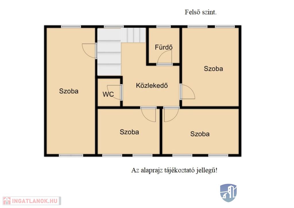A felső szinten 4 tágas szoba -melyből az egyik külön légterű, különálló fürdő és wc valamint egy közlekedő található.