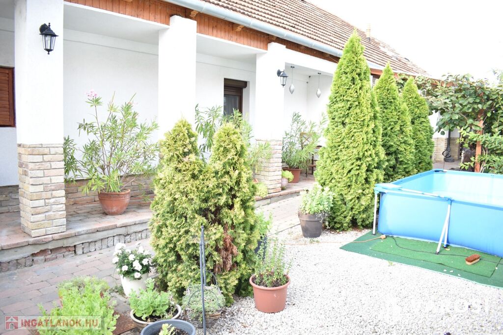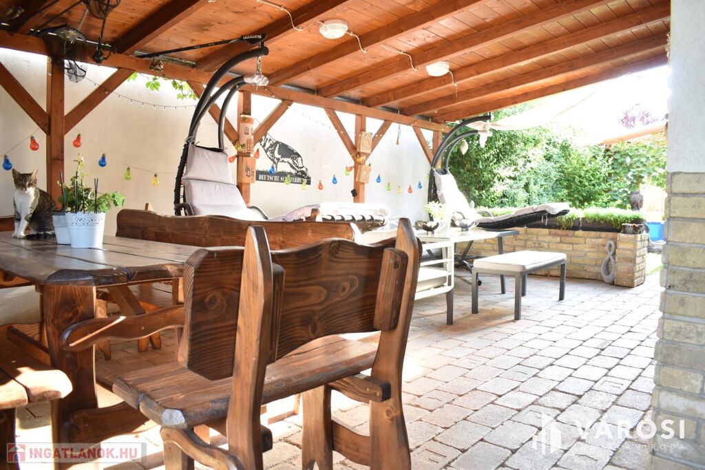 Az ingatlanhoz tartozik egy 501 m2-es teljesen körbekerített, parkosított udvar is, ahol egy hatalmas és hangulatos fedett terasz lett kialakítva. A kertben lévő növények locsolása szinte költségmentesen egy fúrt kút segítségével elvégezhető.